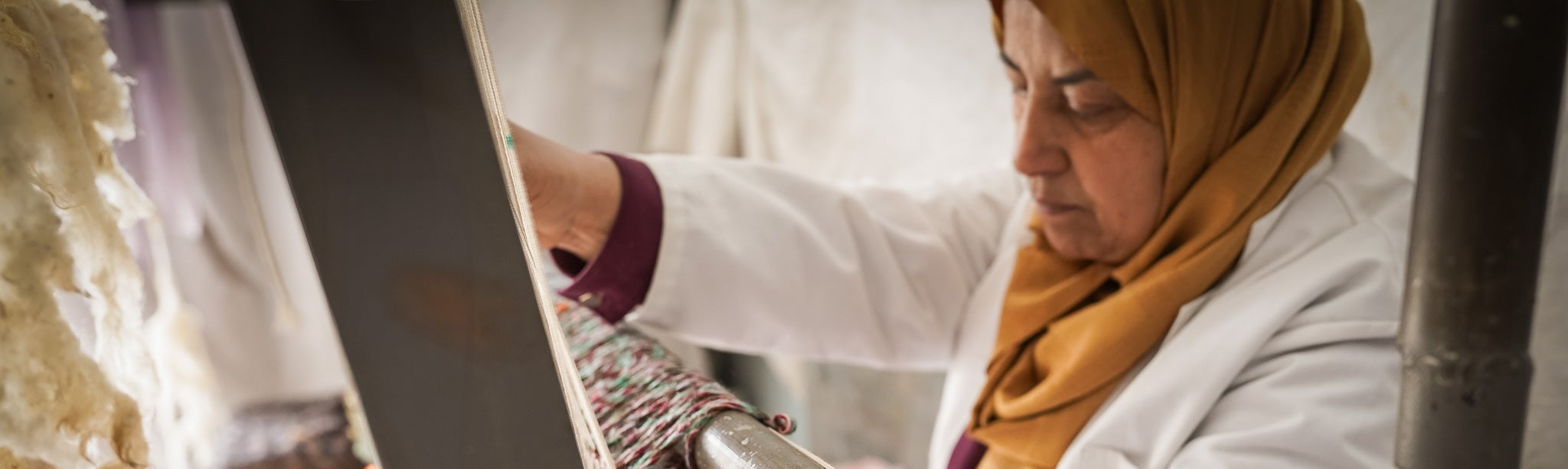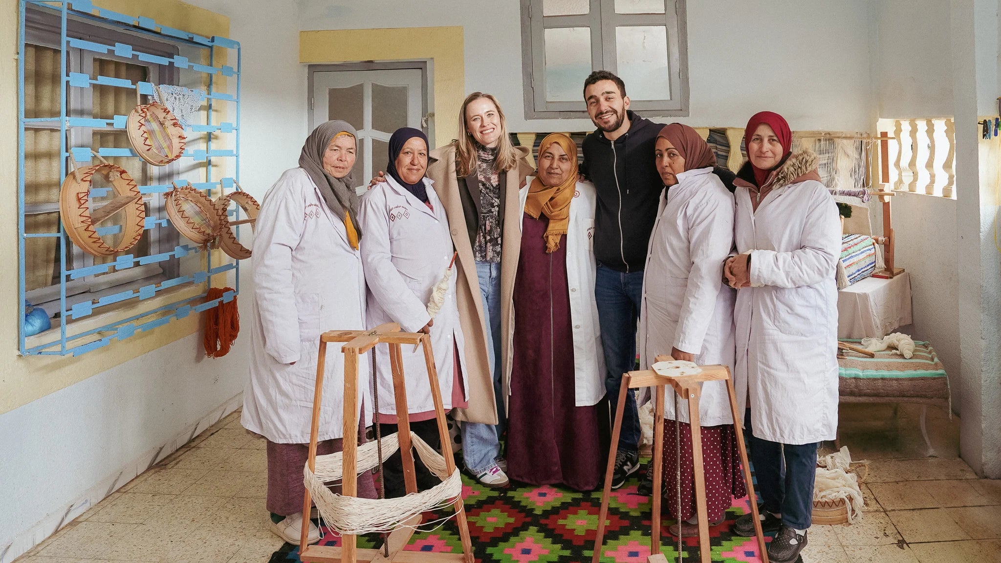 Cherifa ( the woman in the middle of the photo ) is a self-taught rug weaver who lives in the small town of Lekef in northern Tunisia. When she noticed that many women over 40 in her region had never learned a trade but still needed to earn an income, she decided to take action. She began teaching herself the craft of rug weaving, and soon after, started training other women in her community. Today, Cherifa leads a small network of female artisans who weave with skill, pride, and purpose – creating not only rugs, but sustainable livelihoods.